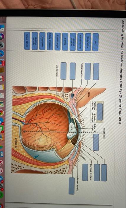The orbit is open anteriorly where it is bound by the orbital septum which forms part of the eyelidsPosteriorly the orbit angles inward such that their apices communicate with the intracranial compartment via the optic canal and. The Sectional Anatomy of the Eye Superior View Part 1 Part A Drag the labels onto the diagram to identify the sectional anatomy of the eye superior view. Anterior iris and ciliary body and posterior choroid The internal layer or the sensory part of the eye the retina.
